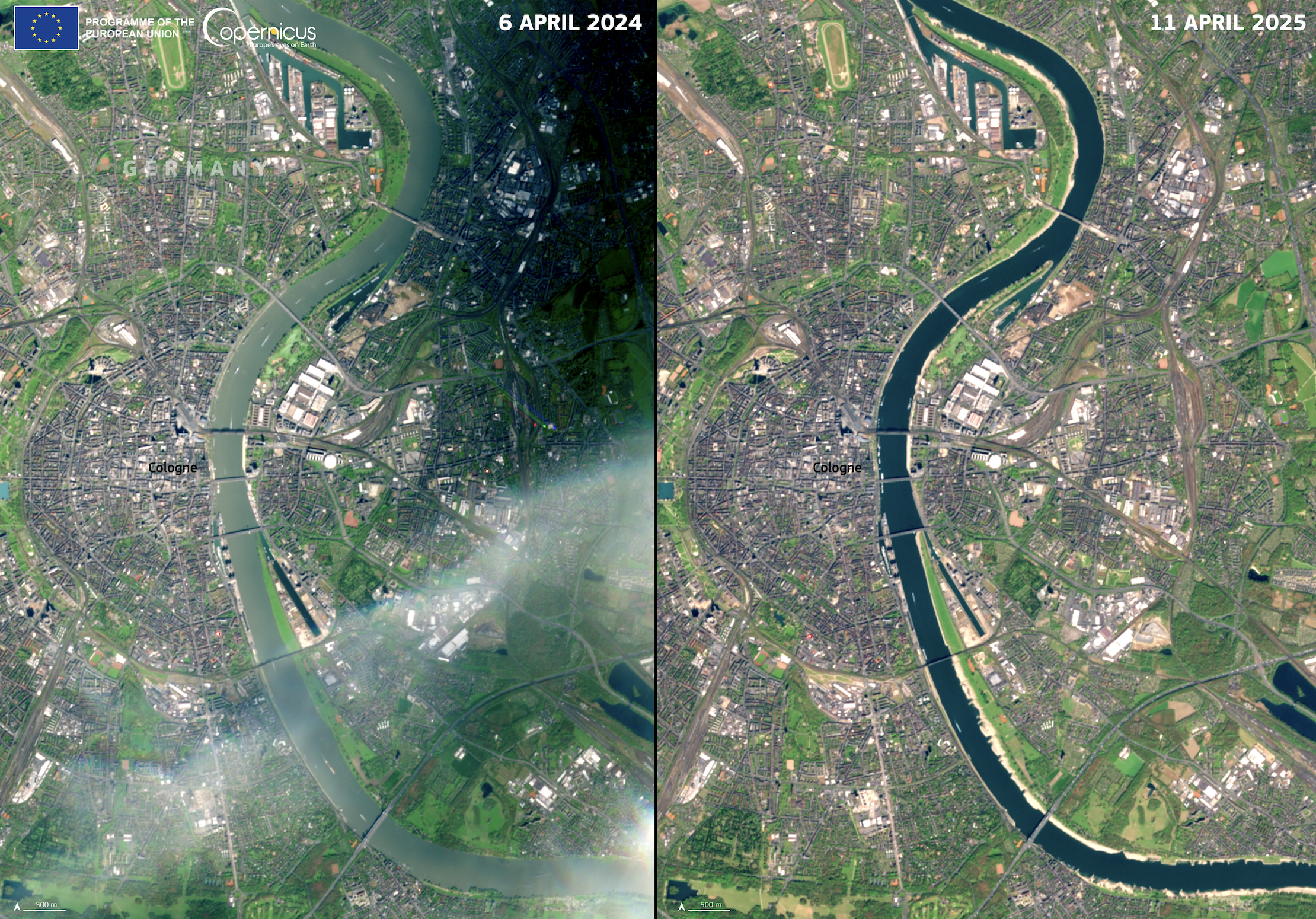 Copernicus Sentinel-2 satellite images from 6 April 2024 and 11 April 2025 highlight the impact, showing a noticeable increase in exposed sandbanks along the Rhine near Cologne due to the significantly lower water level in 2025.