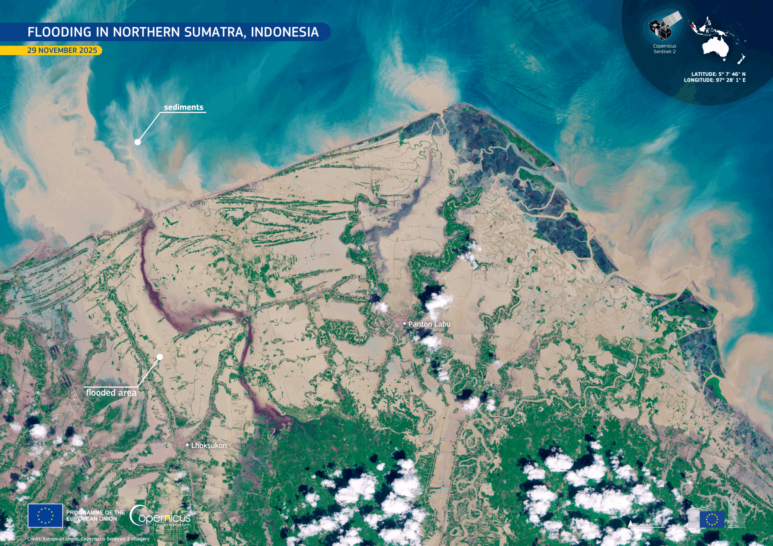 This image, acquired by one of the Copernicus Sentinel-2 satellites on 29 November 2025, shows extensive inundation across Aceh province, with towns such as Lhoksukon and Panton Labu surrounded by floodwaters. Sediment-laden plumes discharged into the sea along the northern coast indicate substantial river outflow, caused by the heavy upstream rainfall.